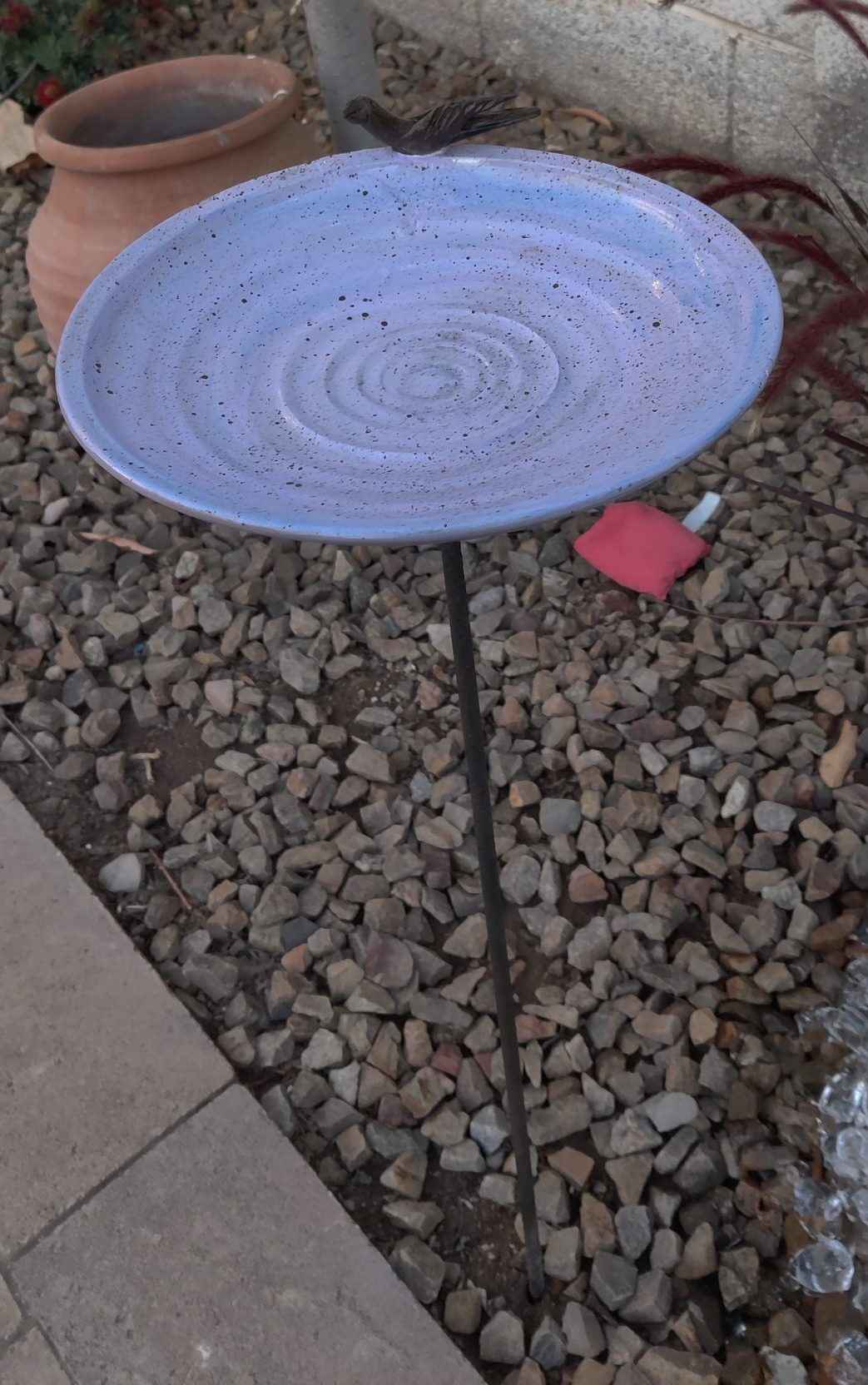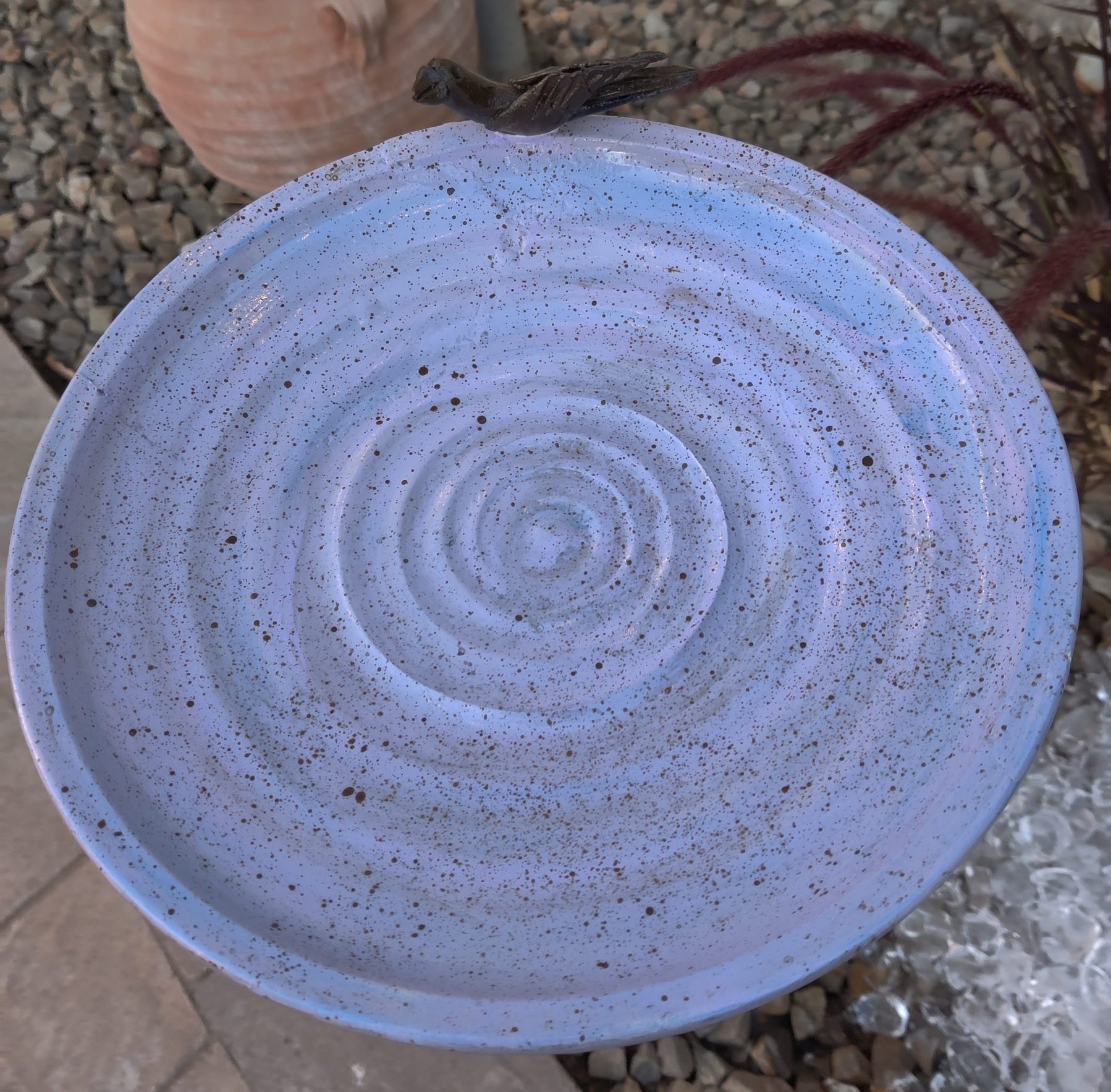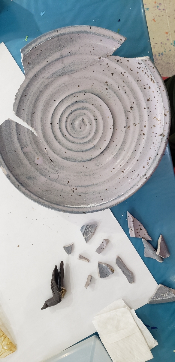 This ceramic bird bath was brought in and held sentimental value as it was handmade specifically for this woman who was looking to have it pieced back together and repaired.. It had been accidentally knocked over by the landscaper and shattered into many pieces. We reattached several pieces before we remembered to snap a photo, however, you can see from the photos how it was shattered. Even the poor bird was missing a wing.