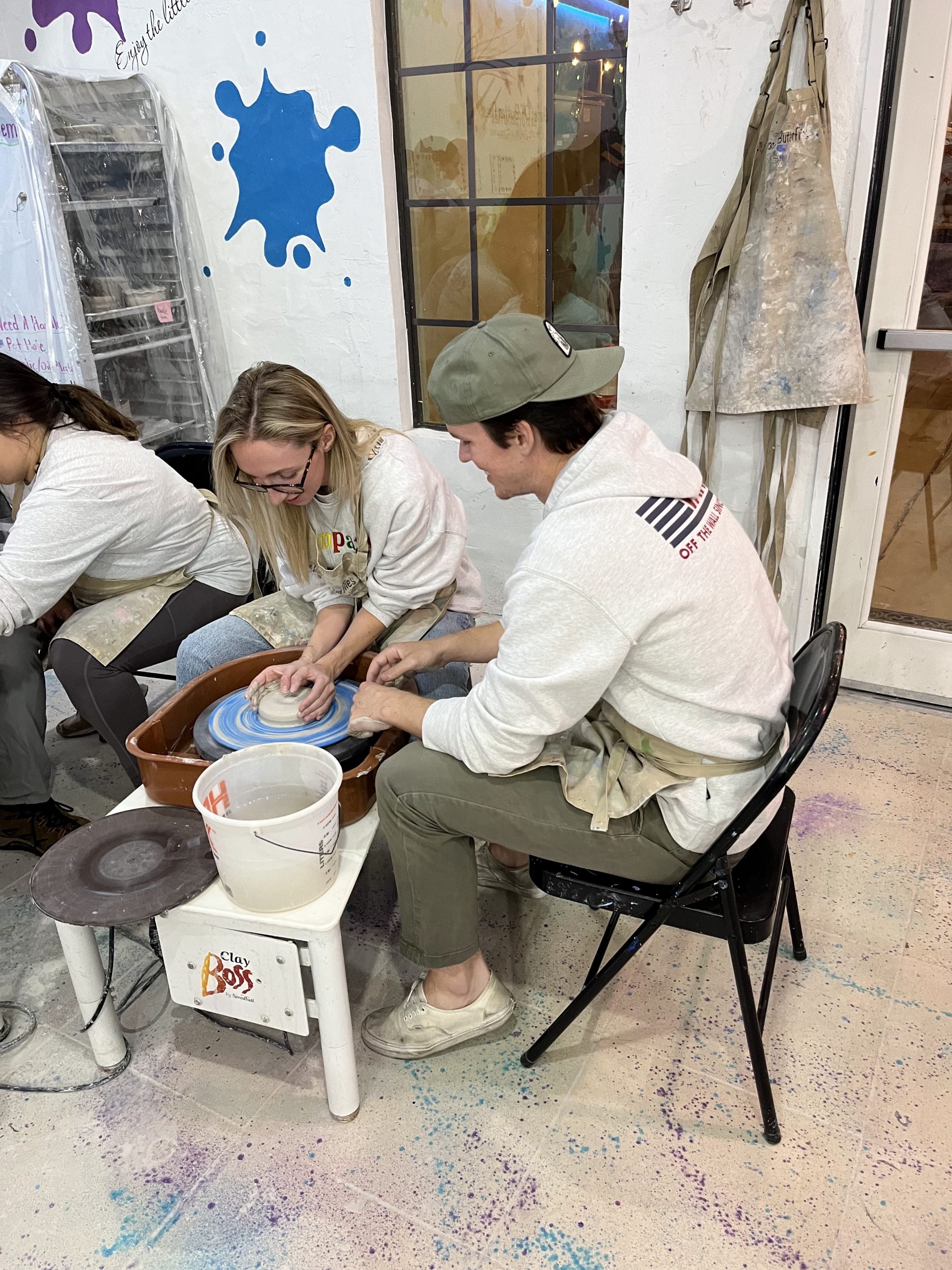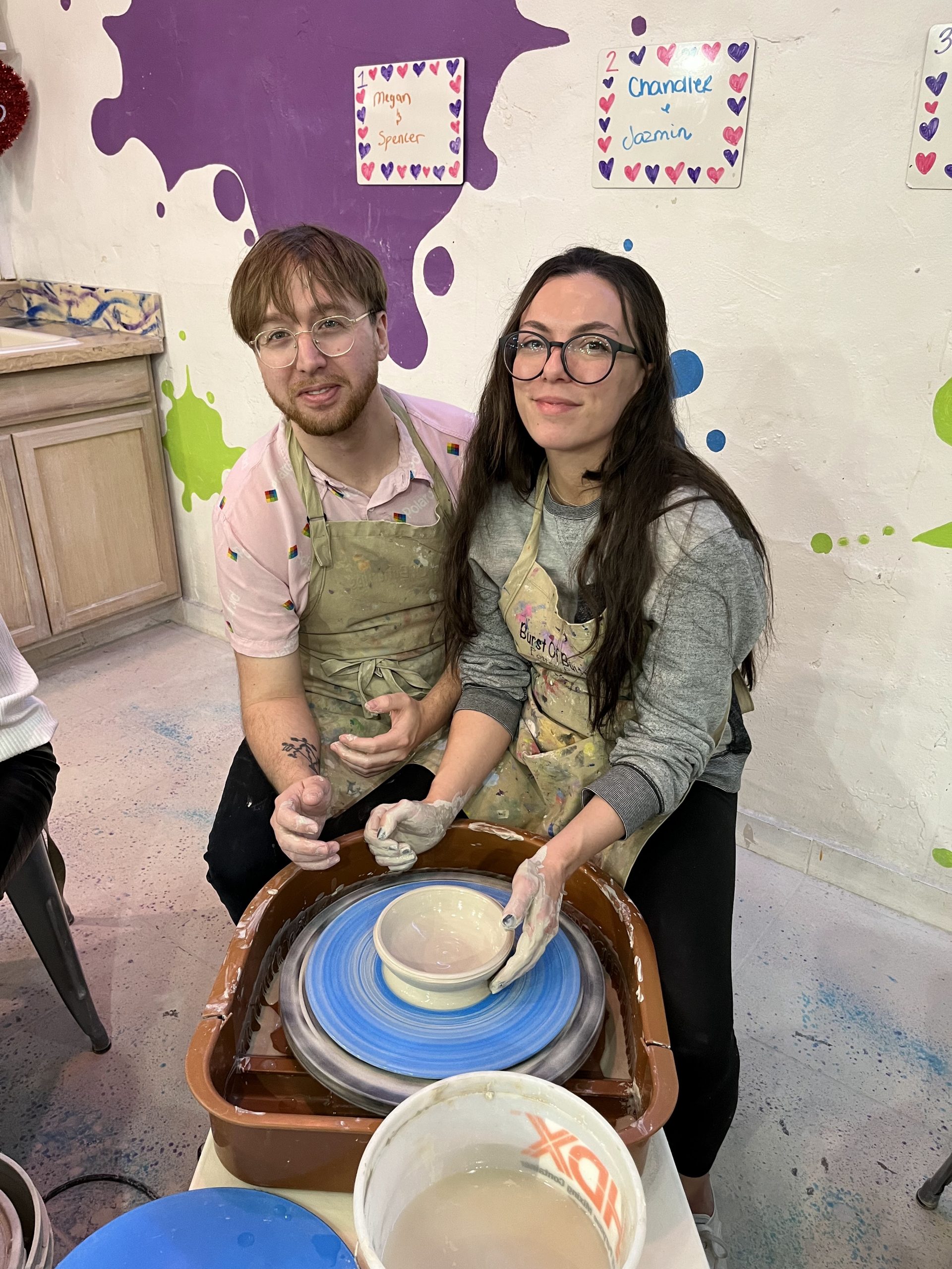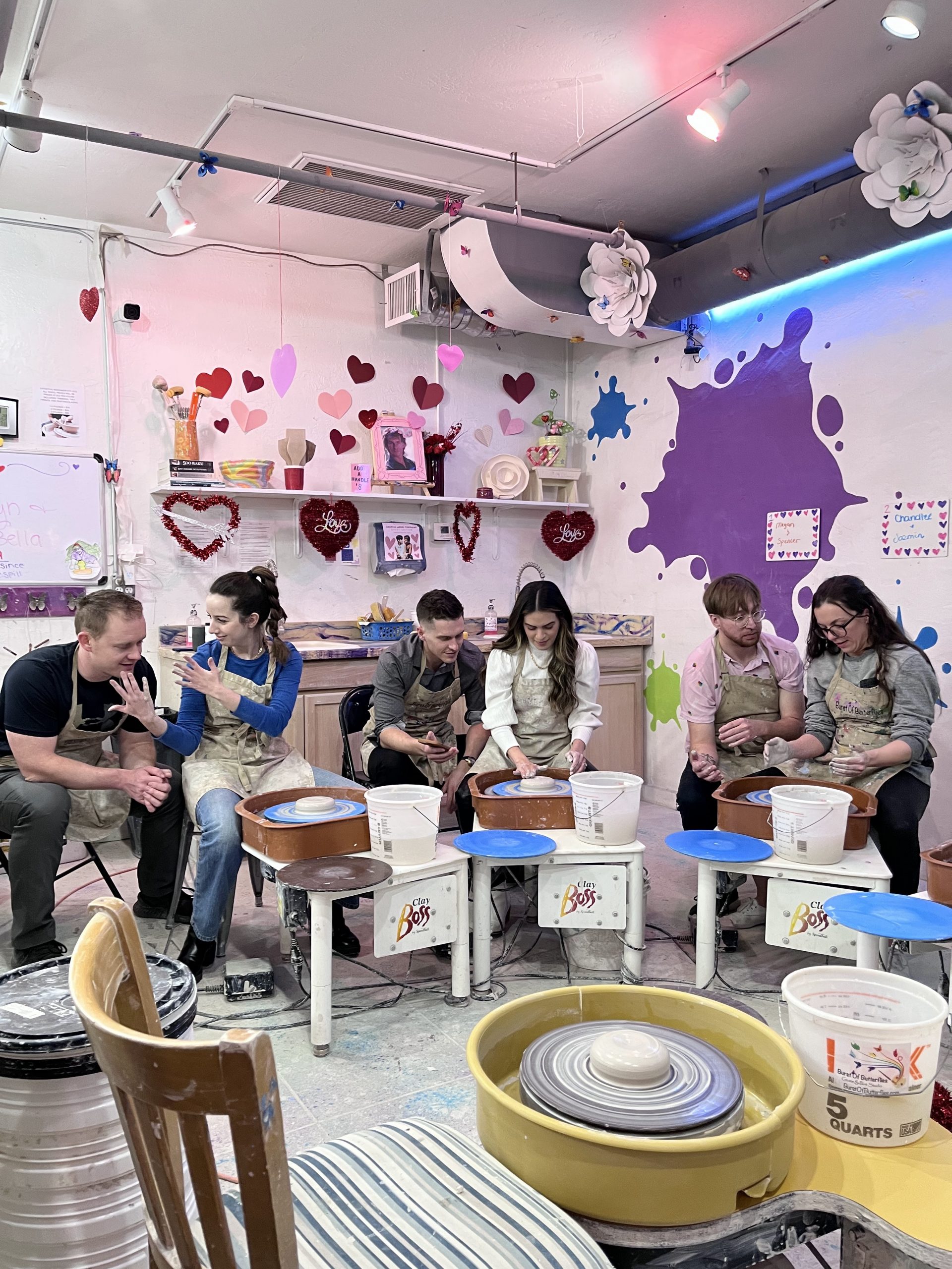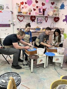 Couples learned all the basic steps of wheel throwing starting with centering, making a hole, then pulling the walls up to create a bowl or vase. Participants made around 3 pieces each. Once pieces are dried and then fired, participants get to come back to paint them, no extra charge!