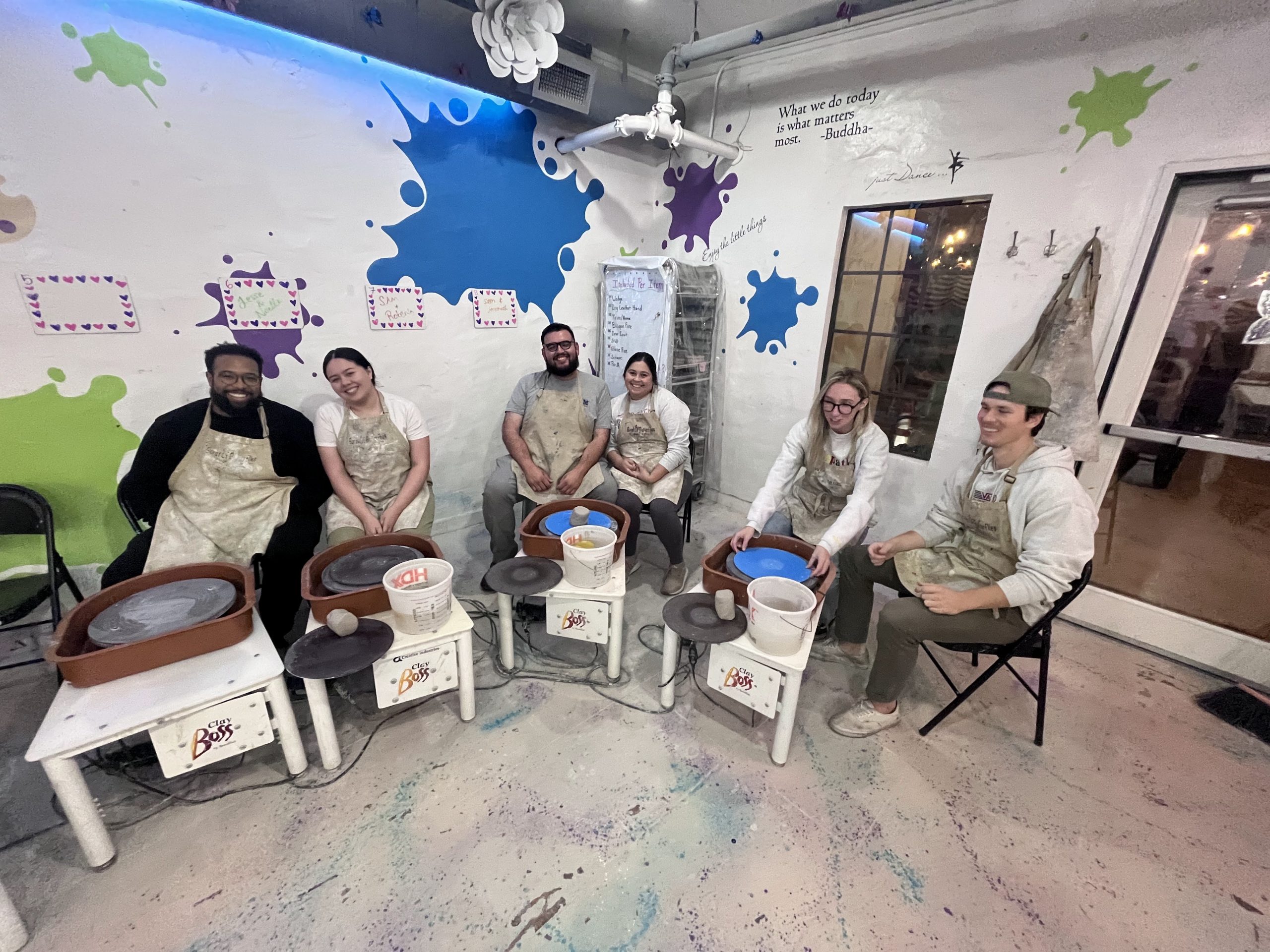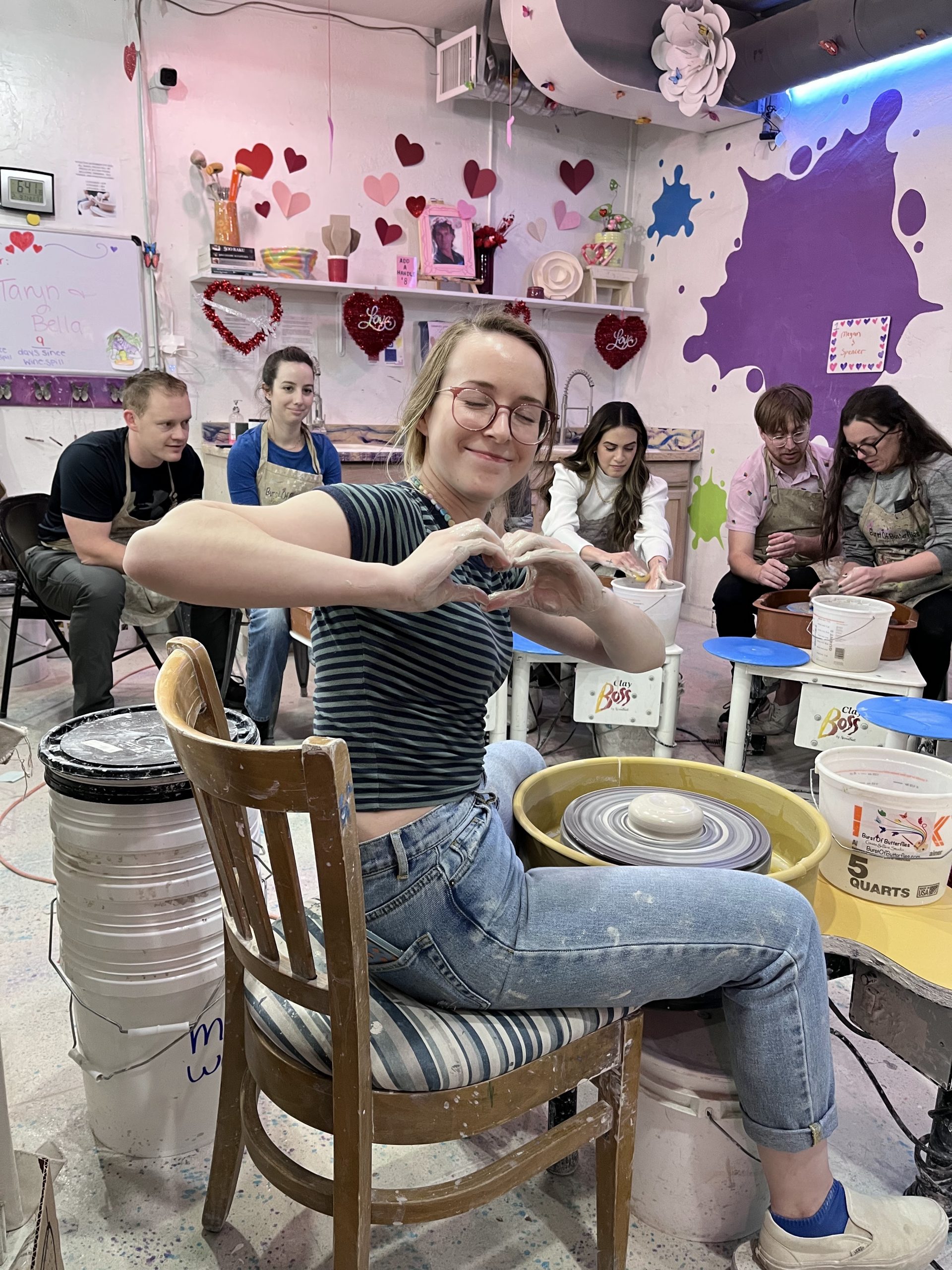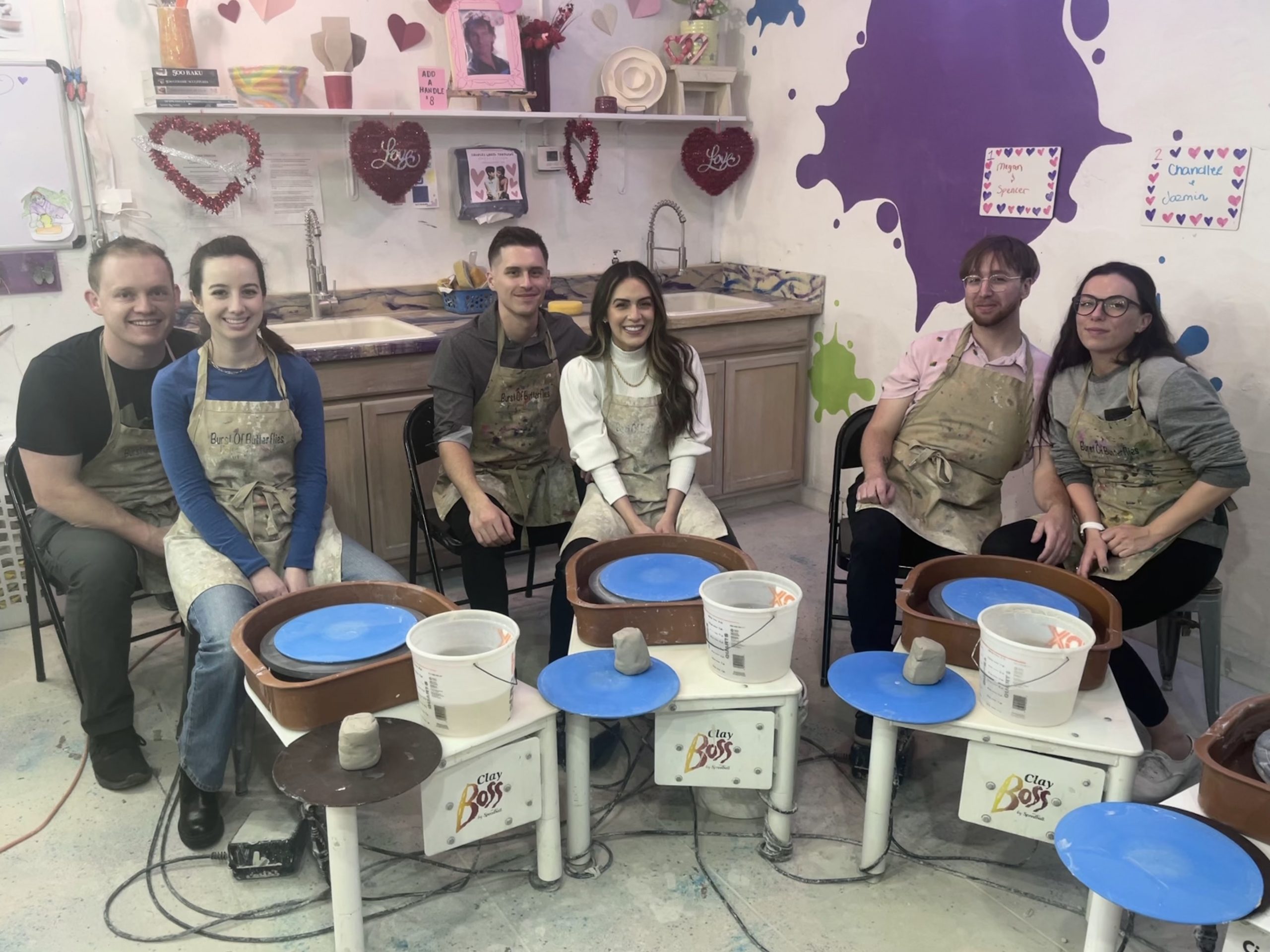 Couples learned all the basic steps of wheel throwing starting with centering, making a hole, then pulling the walls up to create a bowl or vase. Participants made around 3 pieces each. Once pieces are dried and then fired, participants get to come back to paint them, no extra charge!