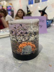 In this project, students worked with polymer clay to created their very own “Haunted Snow-Globe.” They created pumpkins, trees, tombstones, cats, mushrooms, and more to be the base of their snow-globe, then glued their creation to the bottom of the lid. Then, they added a mixture of water and glue and their choice of glitter to the jar to create a snow-globe!