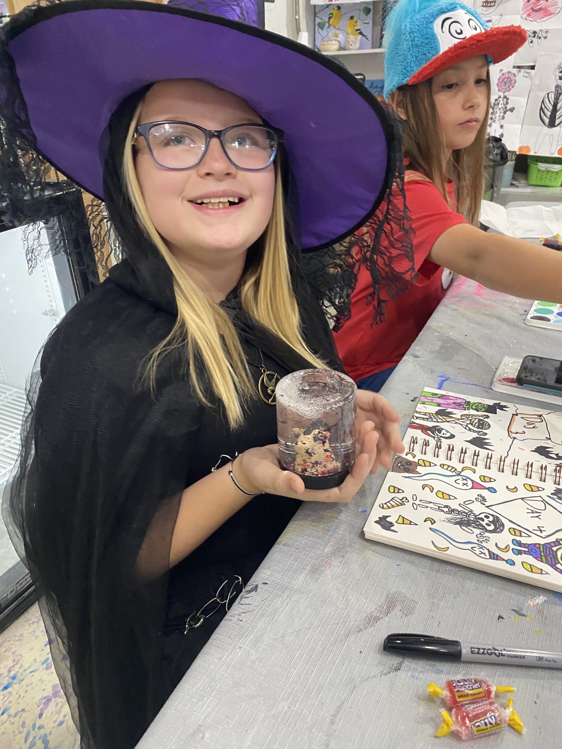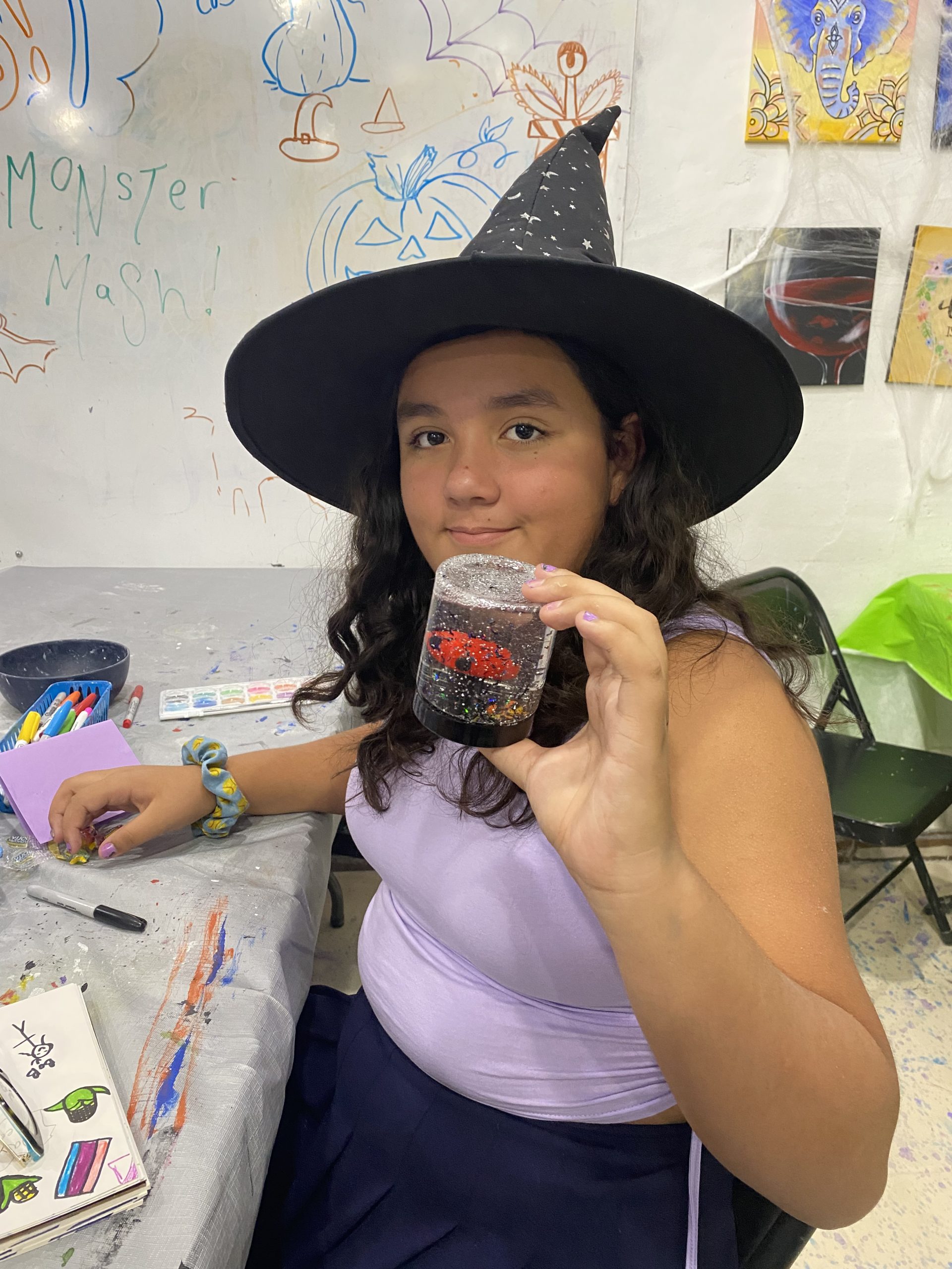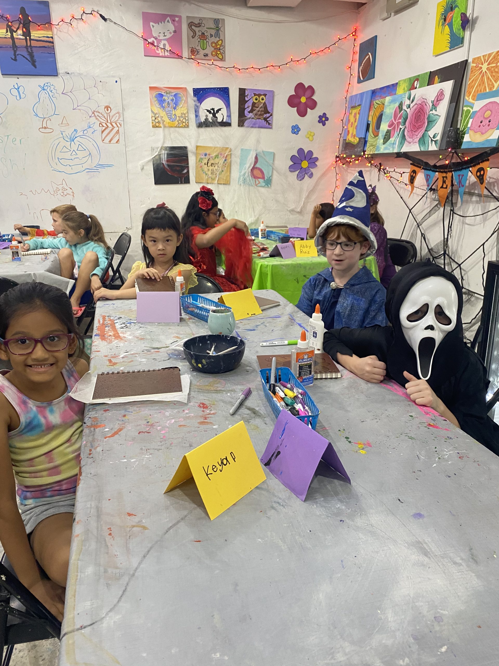 Along with these projects, students painted pottery, made wood board art, and made personalized trick or treat tote bags. The last day of camp was spent assembling all the projects and seeing the final result of each one, as well a costume party on the patio including games, face painting and hydro dipping pumpkins!