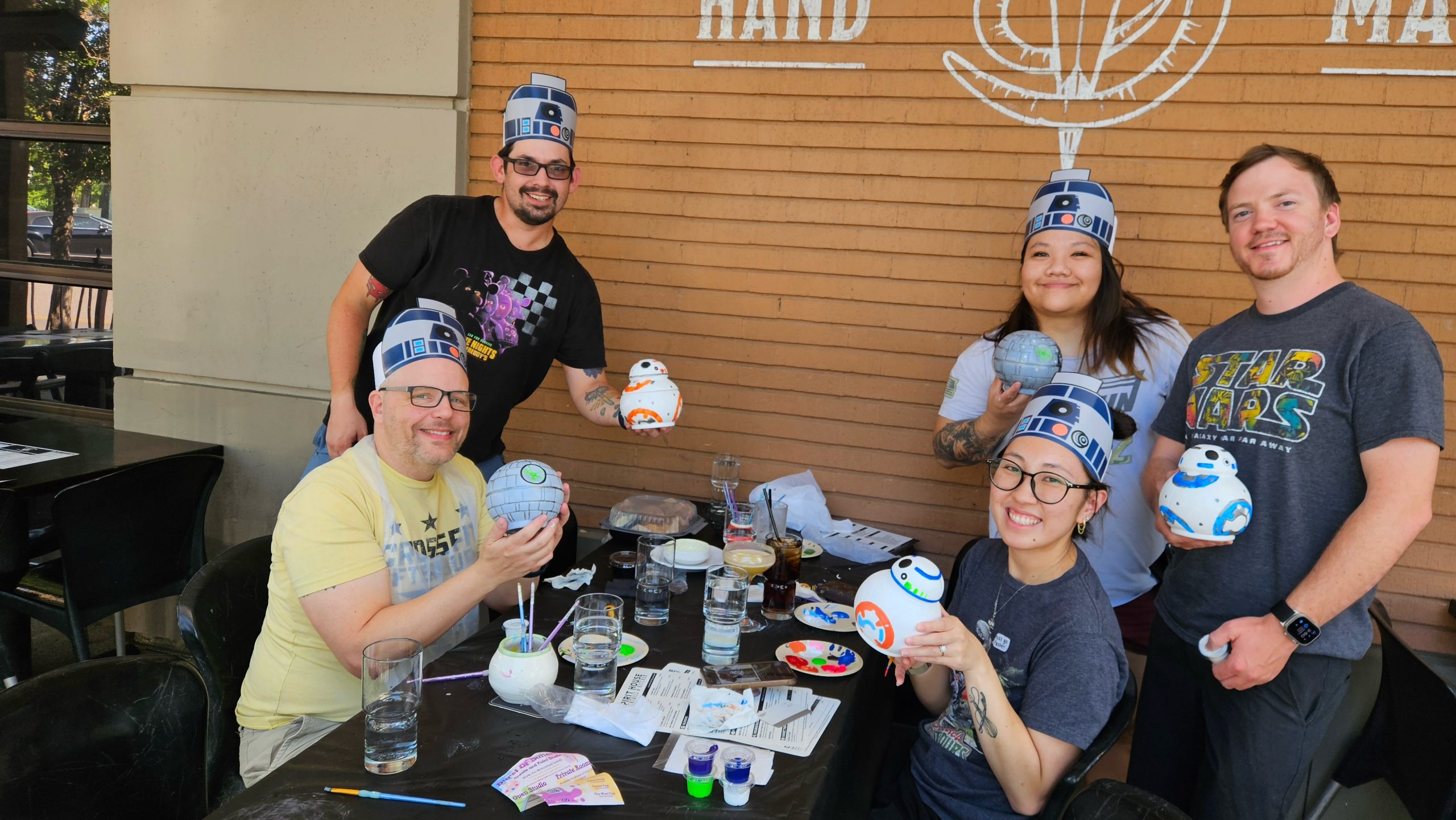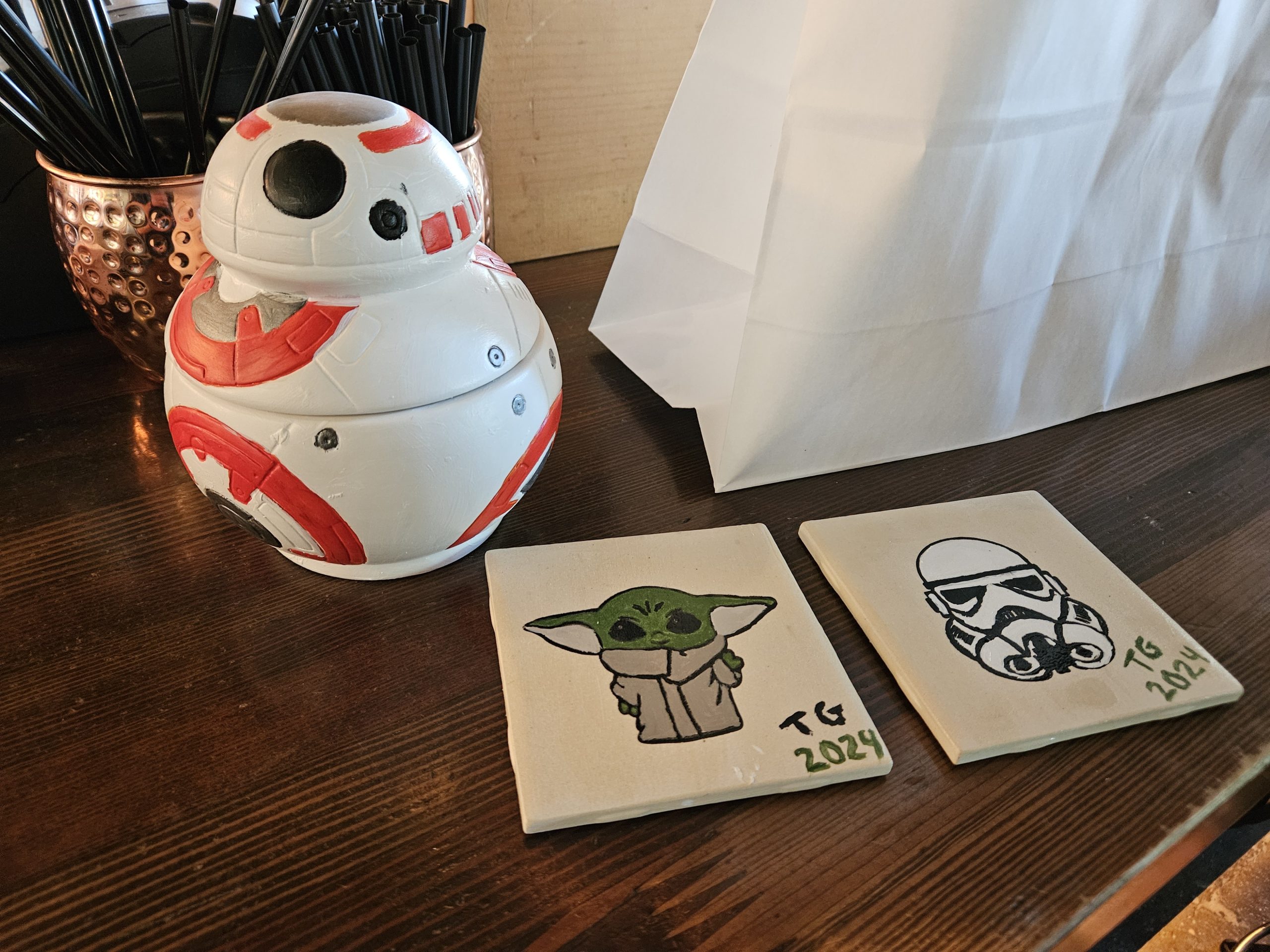We were thrilled to have another amazing turn out at the May The Fourth Be With You Star Wars Event with SanTan Spirit House! A huge thank you to all who joined us for an evening filled with great food, out-of-this-galaxy drinks, and superb creativity! Participants chose between painting two coasters (Storm Trooper, Grogu, or Mandalorian), a BB8 bank or box, a Death Star bank or box, or a Chewbacca planter! Using acrylic paints, everyone let their creativity flow, putting their own person touch on each and every piece.
