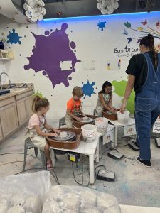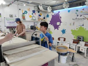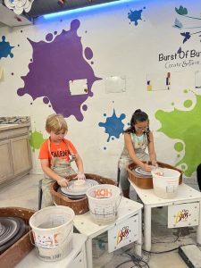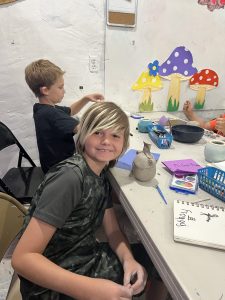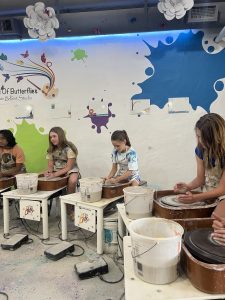 Another big portion of Mud Week camp is getting to experience throwing pottery on the wheel! The first day of camp students learn the basics of being on the wheel! First step is learning how to center and open their pieces.