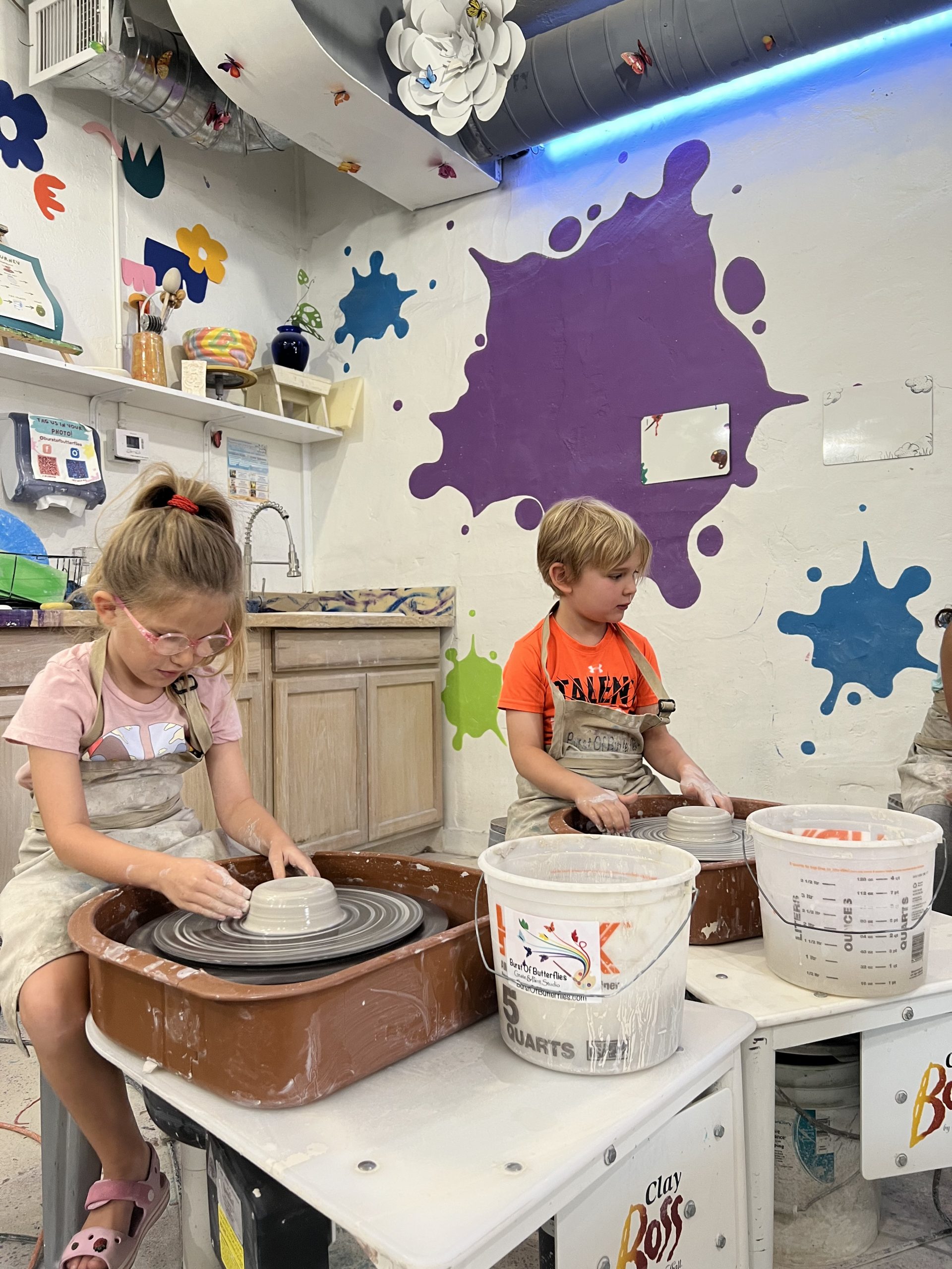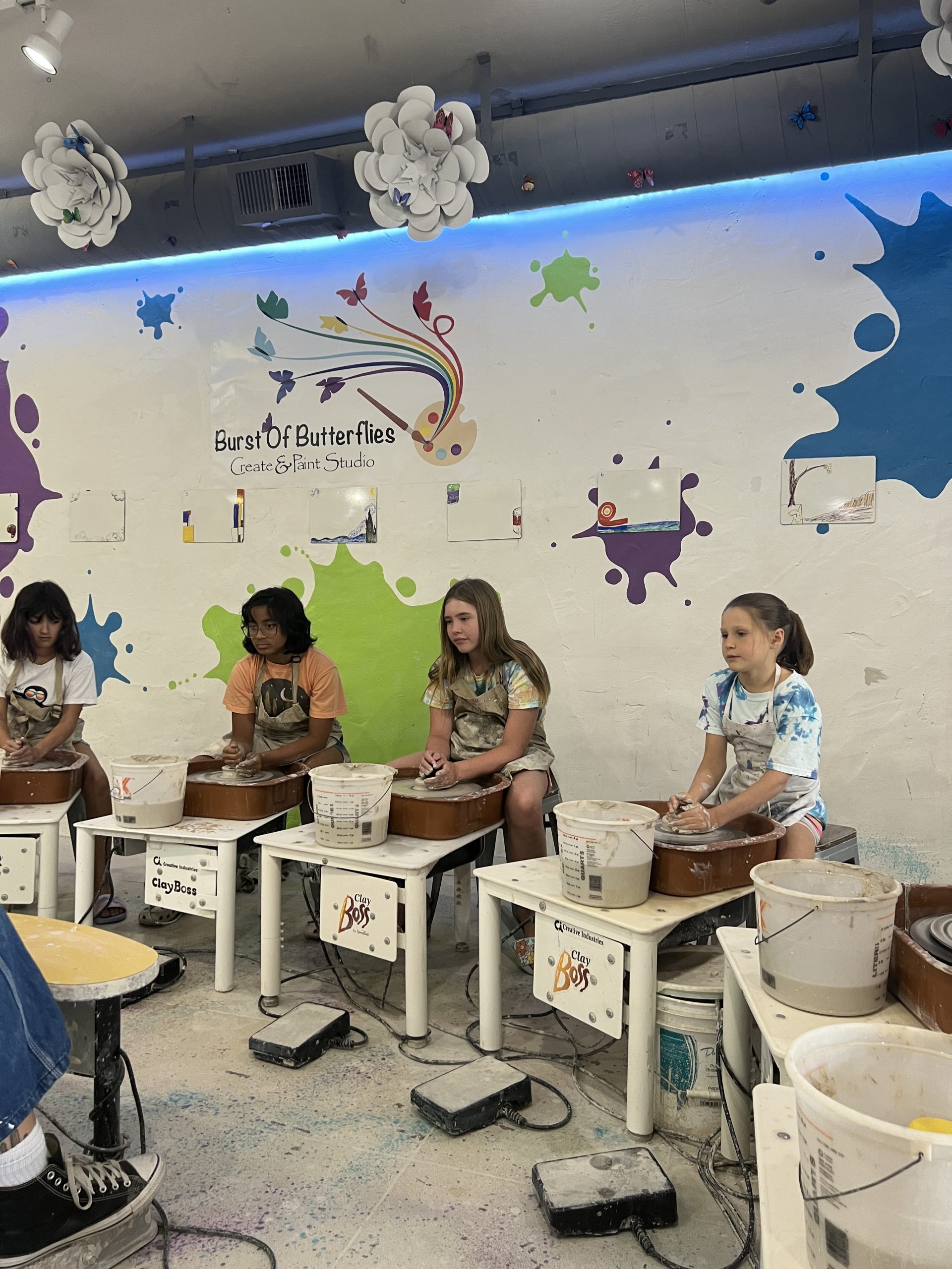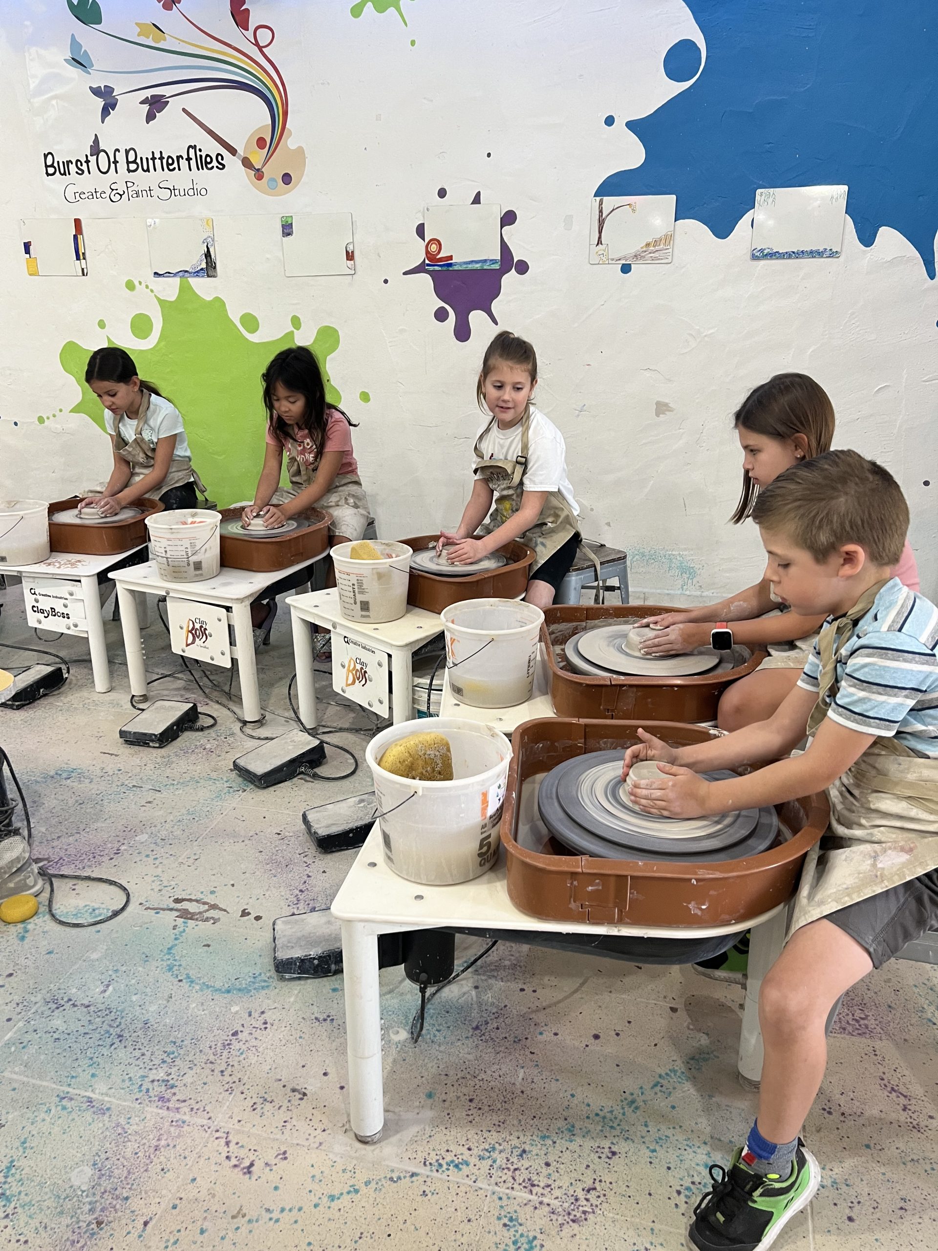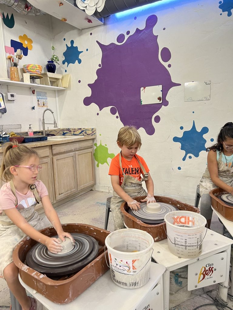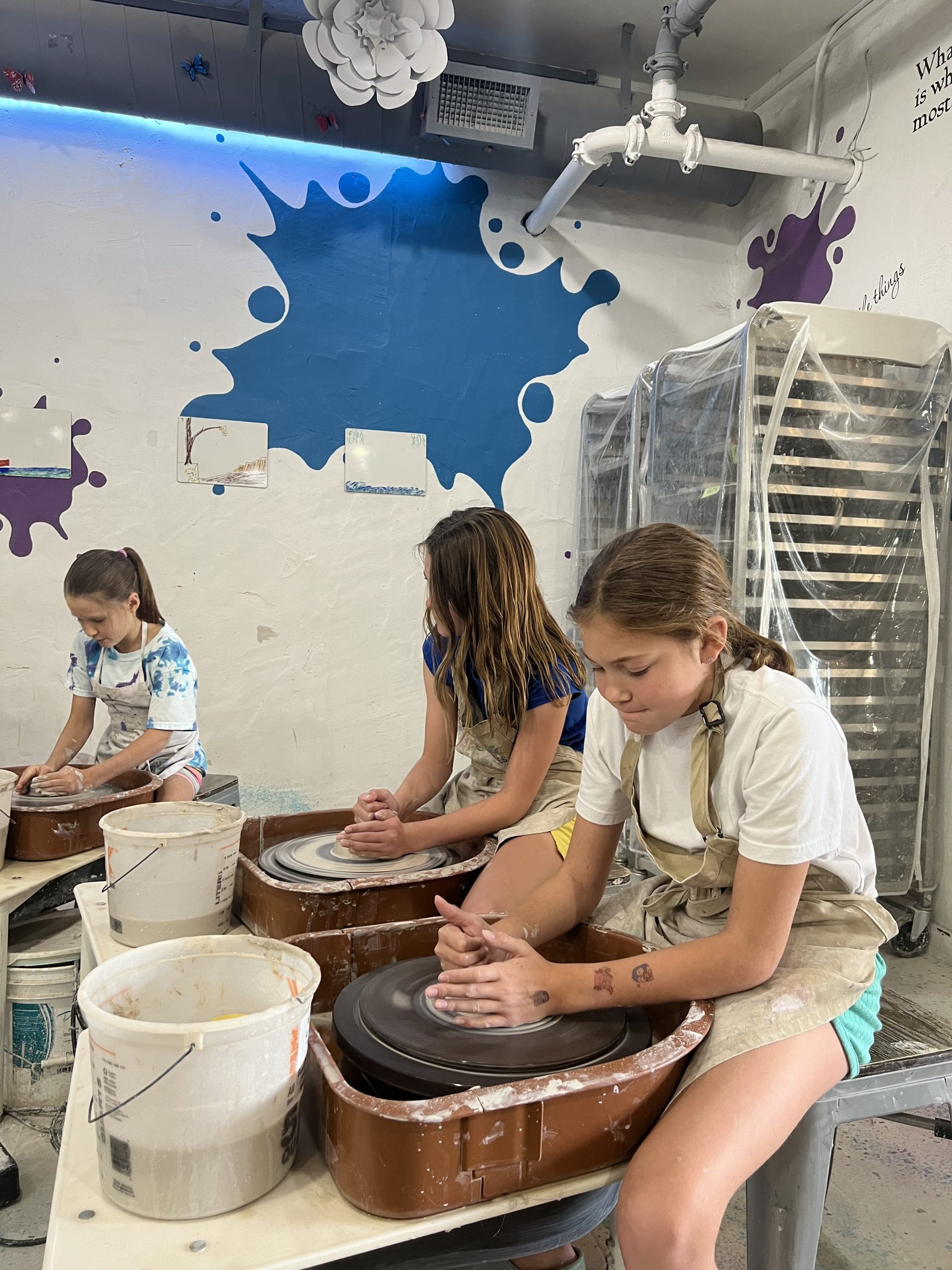 Another big portion of Mud Week camp is getting to experience throwing pottery on the wheel! The first day of camp students learn the basics of being on the wheel! First step is learning how to center and open their pieces.
