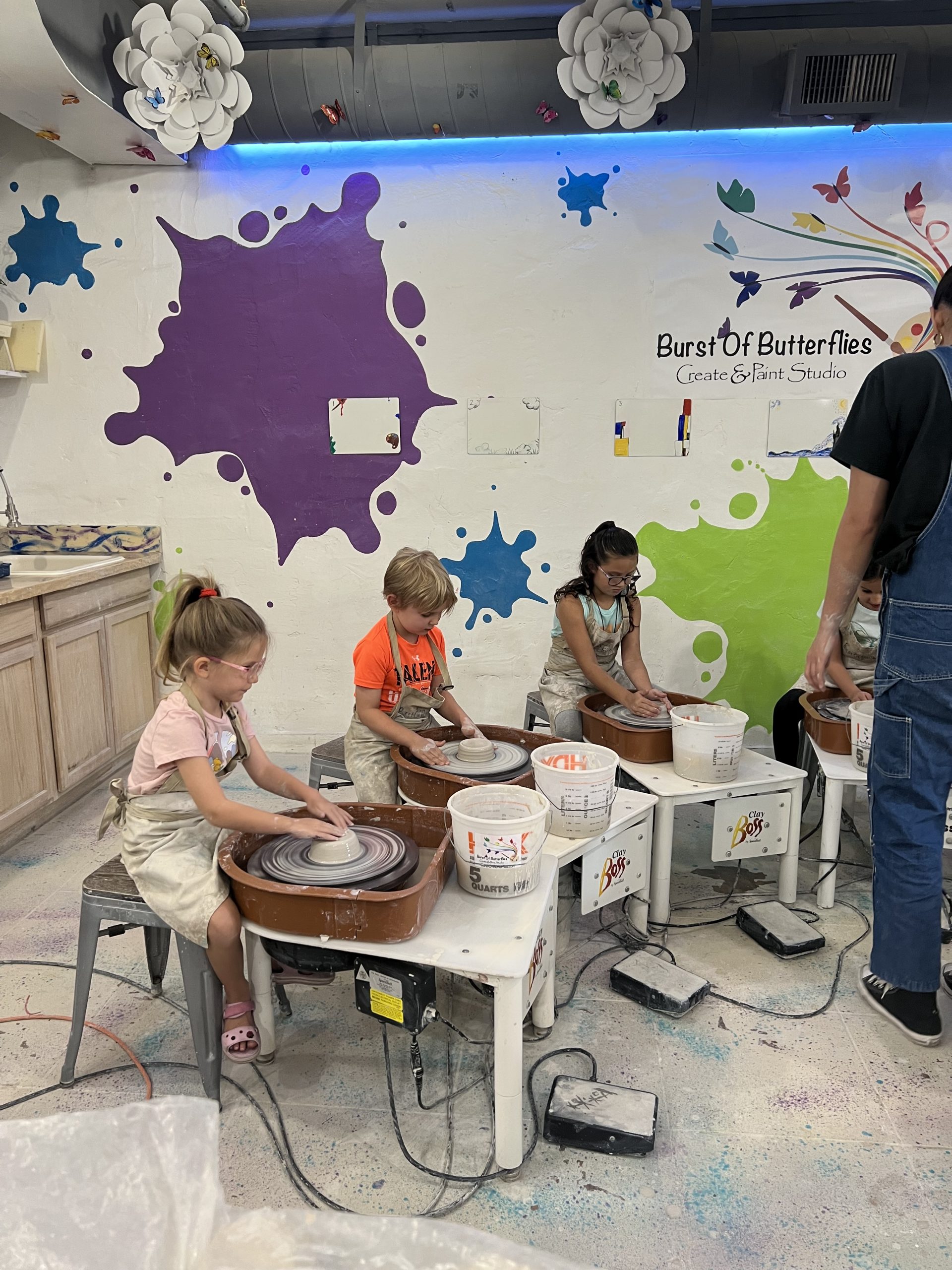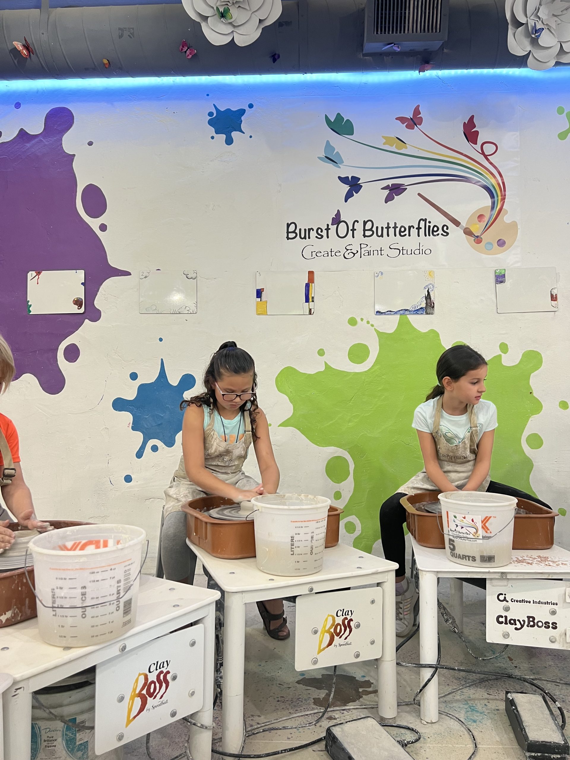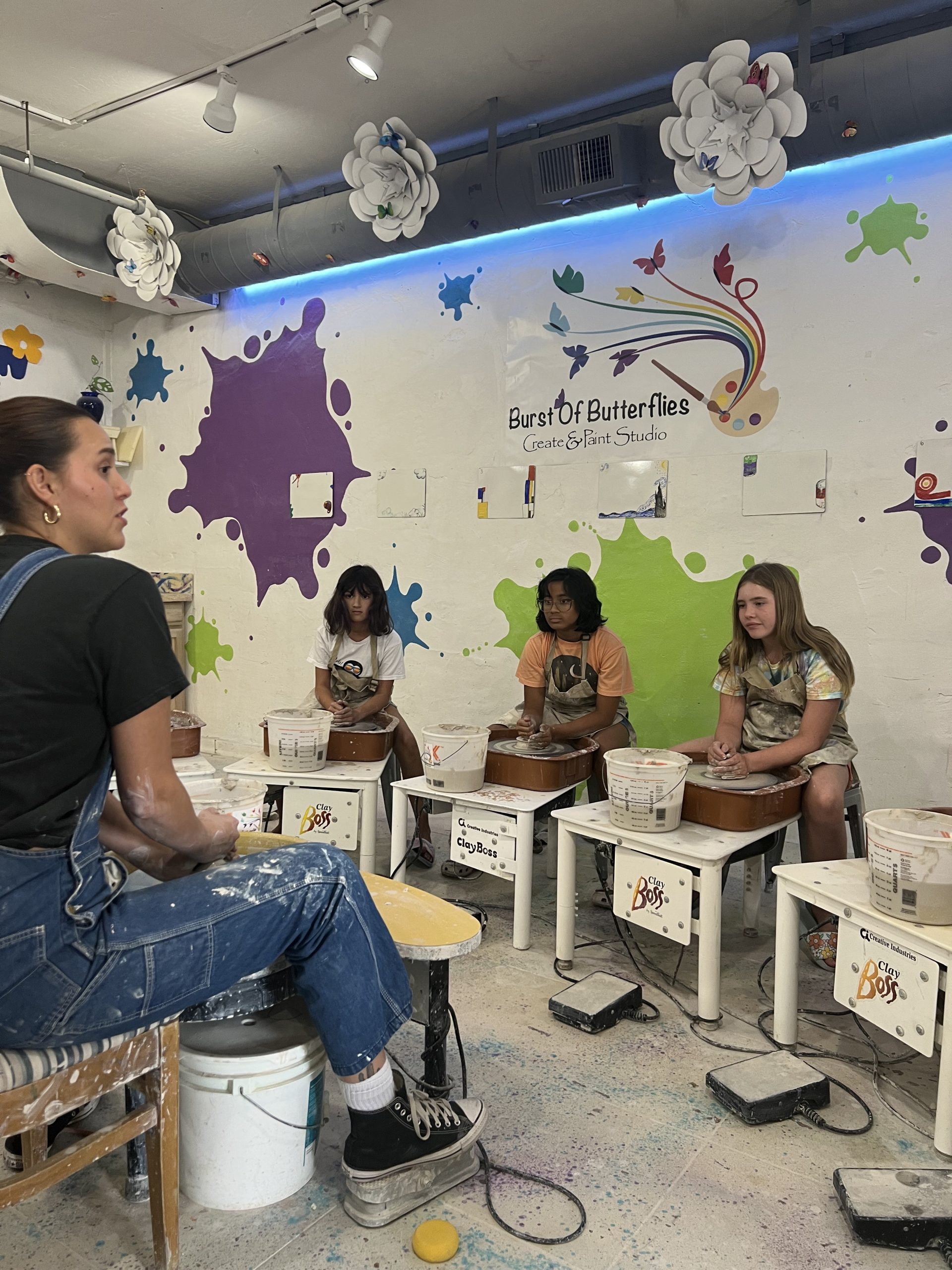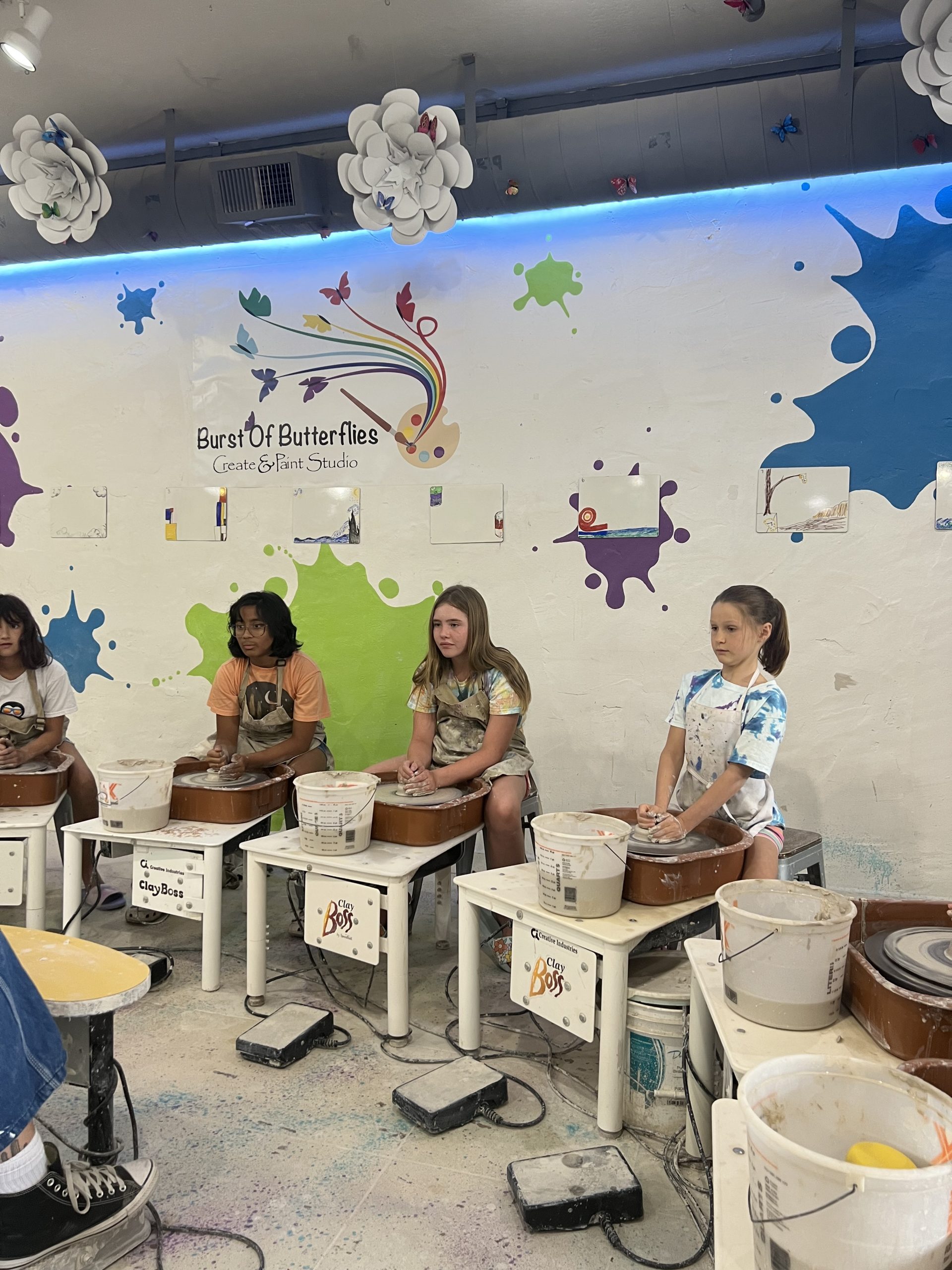 Another big portion of Mud Week camp is getting to experience throwing pottery on the wheel! The first day of camp students learn the basics of being on the wheel! First step is learning how to center and open their pieces.