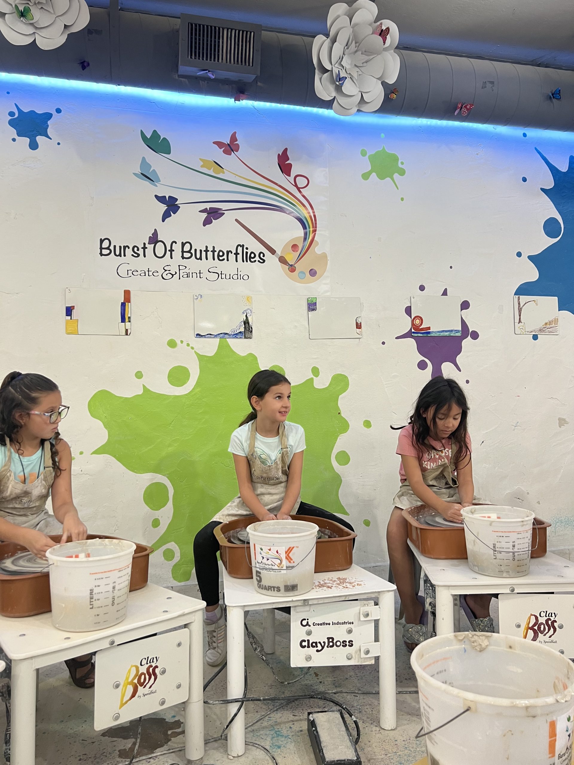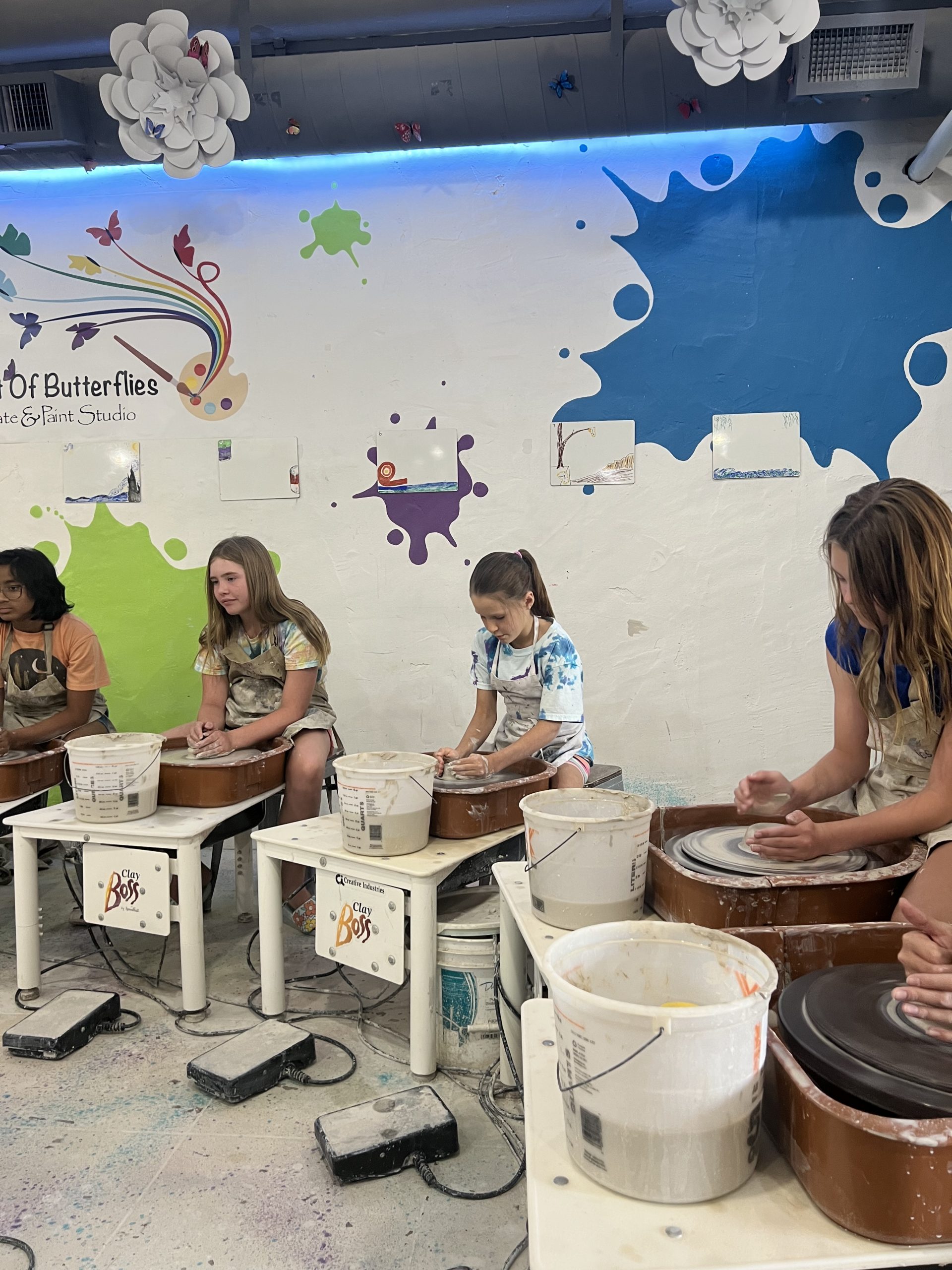 The second day of camp students learn how to pull the walls of their clay and create the shape of their piece! The third day they make their own completed wheel piece!