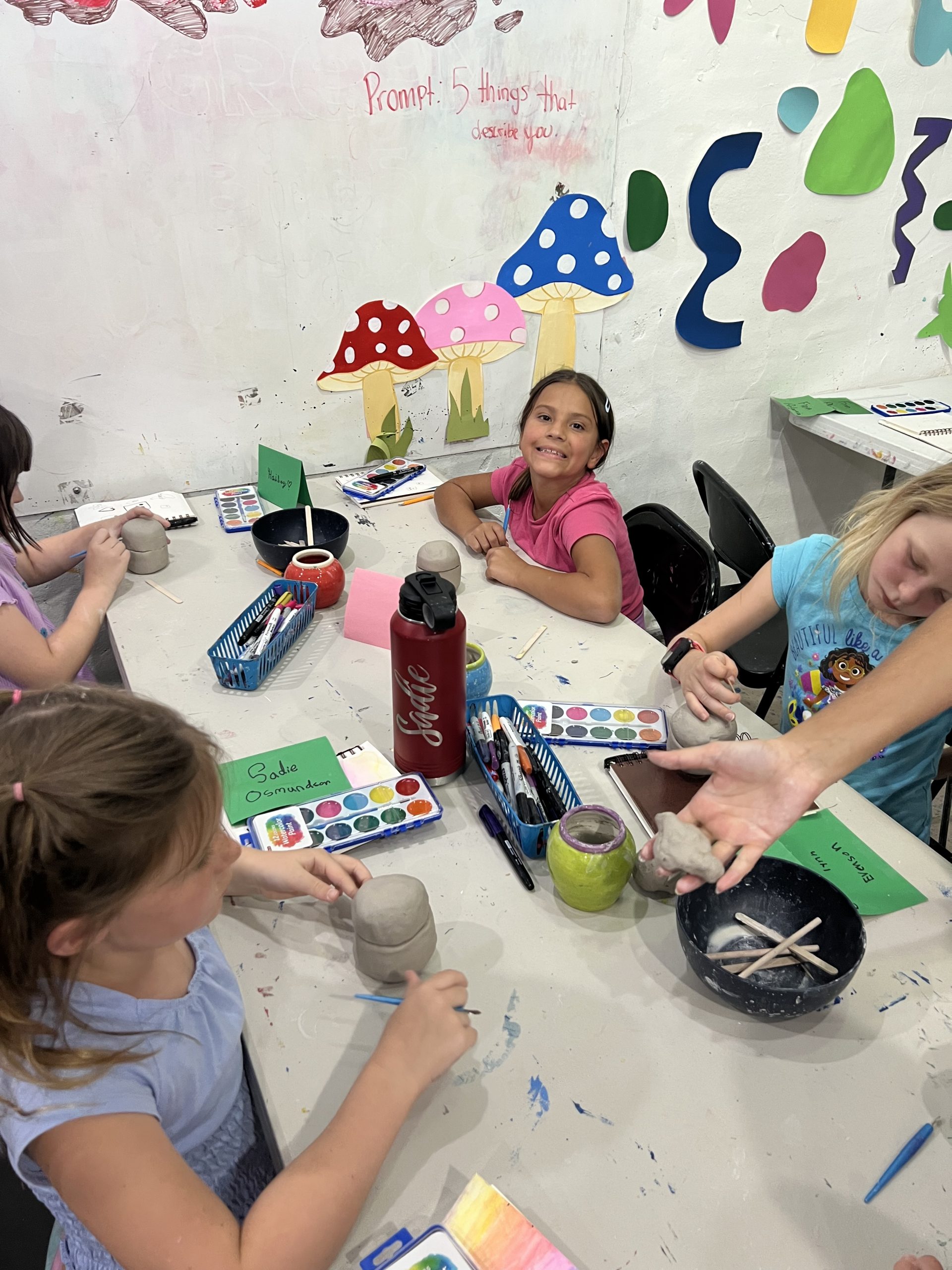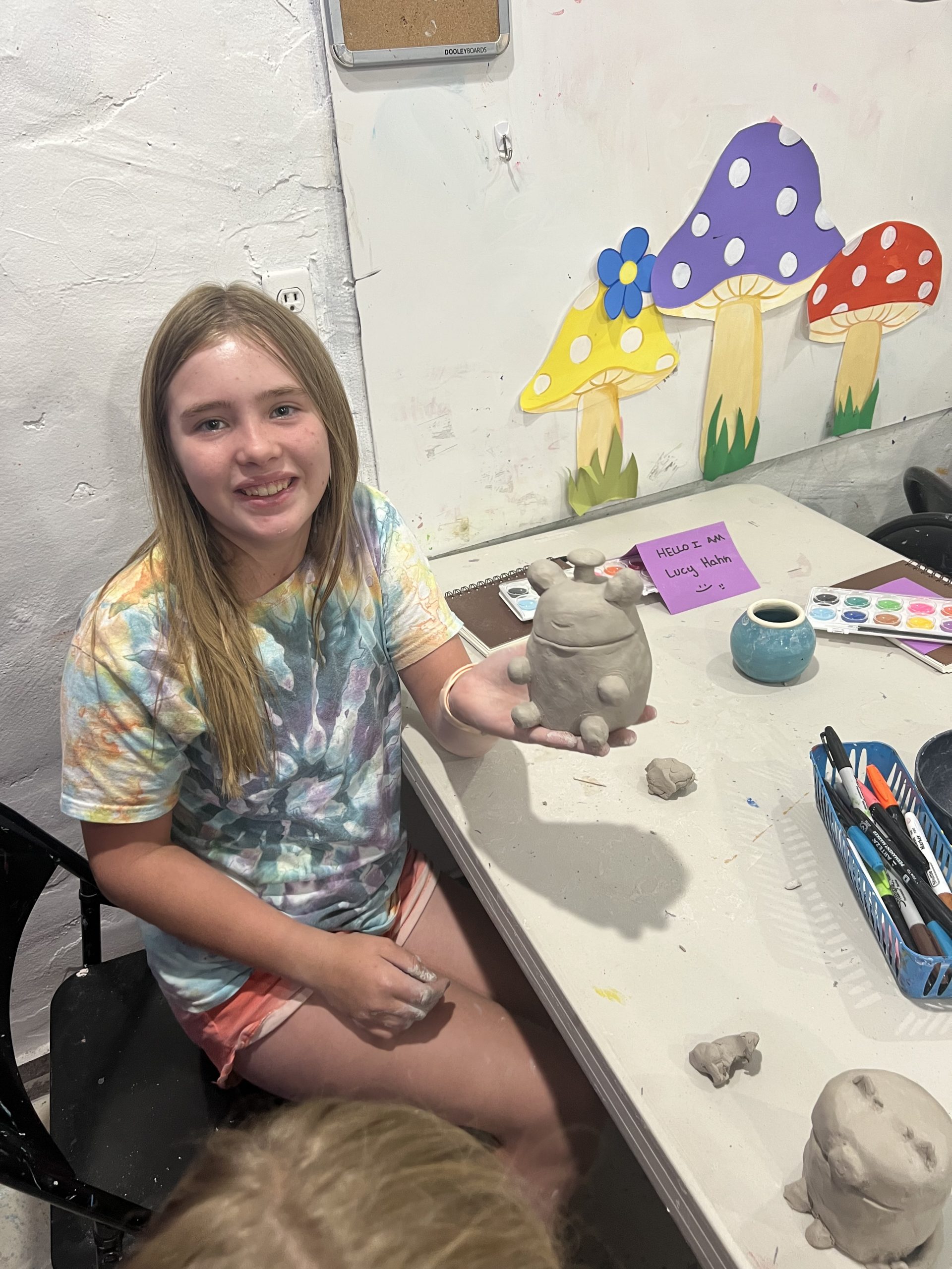 Student learned how to make pinch pot animals, mushrooms jars, slab lanterns, and more! Our instructors go over the entire process of working with clay. They going over the importance of scoring, slipping, and attaching each addition to their clay creations.