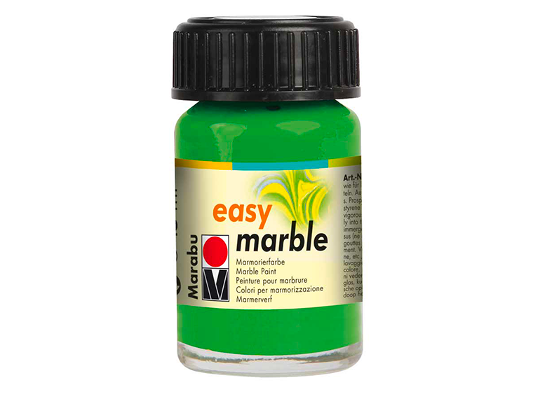 Easy Marble is a solvent-based paint used with water to create quick and elegant marbled patterns on either flat surfaces or dimensional objects. Just drip, swirl, dip and done! It adheres to paper, glass, plastic, metal, wax, wood, papier-mâché, polyester, polypropylene, smooth foam and many other surfaces.