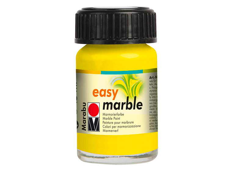 Easy Marble is a solvent-based paint used with water to create quick and elegant marbled patterns on either flat surfaces or dimensional objects. Just drip, swirl, dip and done! It adheres to paper, glass, plastic, metal, wax, wood, papier-mâché, polyester, polypropylene, smooth foam and many other surfaces.
