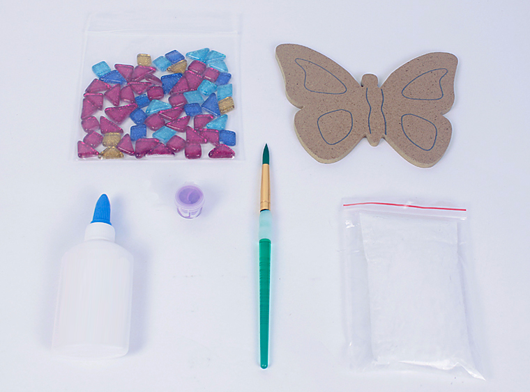 The design of the Mosaic Butterfly Kit is specifically made to be an all-in-one kit for people to take home and enjoy! It does not require a kiln or any special equipment so it’s the perfect kit to give to your customers. The Mosaic Butterfly Kit includes: