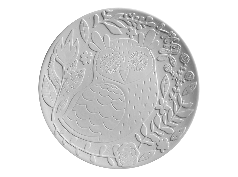 The Natural Owl Plate features tactile patterns with a natural, folksy look. Embossed textures look wonderful when serving food and desserts at gatherings. Market the Natural Owl Plate through various seasonal appeals. Get a winter-esk owl look with whites and blues. For an autumnal style, try ambers and vintage greens. Giving a variety of seasonal touches to this plate is key as it can be used as a display dish in the kitchen and a serving platter.