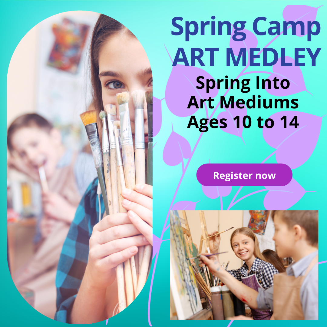 Themed camp for four days and three hours per day. The Spring Art Medley Camp focuses on a variety of art mediums throughout the week including canvas painting, pottery painting, wood board art, mixed media, art journaling, water color painting, polymer clay, mosaics, and more.