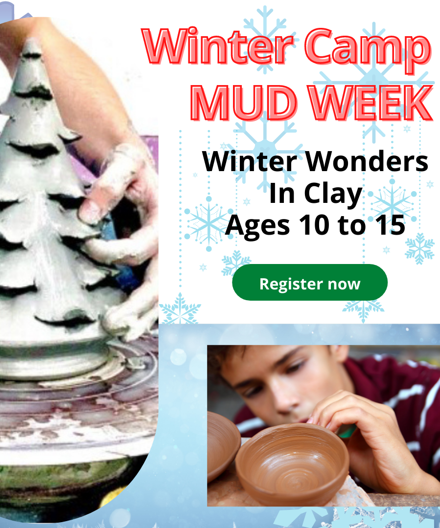 Burst Of Butterflies Studio has an exciting Winter Break Art Program for ages 10 to 15. Mud Week Winter Edition. Utilizing clay in hand-building and wheel throwing, we will be creating snow flakes, holiday ornaments, custom created and carved clay holiday evergreen trees, coil pots, hand created snow figures. Kids love Mud Week!