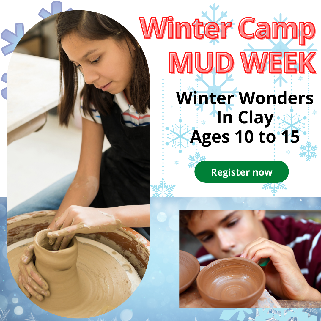 Burst Of Butterflies Studio has an exciting Winter Break Art Program for ages 10 to 15. Mud Week Winter Edition. Utilizing clay in hand-building and wheel throwing, we will be creating five winter themed projects as well as sketching, drawing and painting in an art journal. Kids love Mud Week!