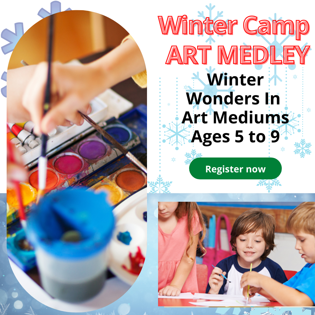 Themed camp for three days and three hours per day. The Winter Wonders Art Medley focuses on a variety of art mediums throughout the week including clay hand-building, canvas painting, pottery painting, wood board art, mixed media, art journaling, water color painting, polymer clay, glass, and more.