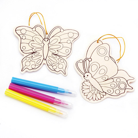 This ready-to-color wood ornament kit includes 2 butterfly wood ornaments and bright markers for decorating. Each kit makes 2 ornaments. Recommended for ages 6 and up. 1 kit per package.