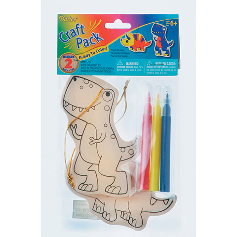 This ready-to-color wood ornament kit includes 2 dinosaur wood ornaments and bright markers for decorating. Each kit makes 2 ornaments. Recommended for ages 6 and up. 1 kit per package.