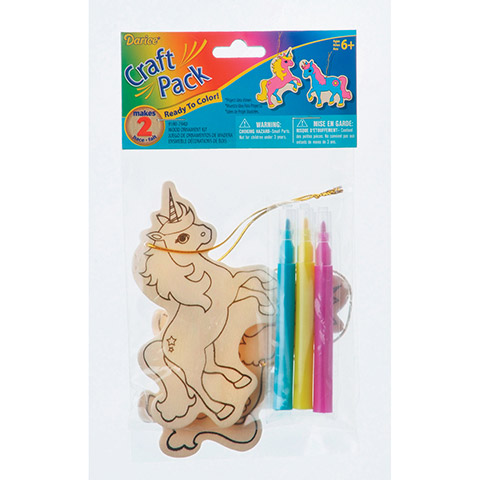 This ready-to-color wood ornament kit includes 2 unicorn wood ornaments and bright markers for decorating. Each kit makes 2 ornaments. Recommended for ages 6 and up. 1 kit per package.