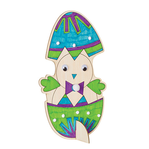 Every little boy or girl will enjoy creating this wooden chick. Each wooden chick comes ready to be decorated and includes a stand for easy displaying. Each set includes 3 markers, 9 pom poms, and 2 eyes. Ages 3 & over.