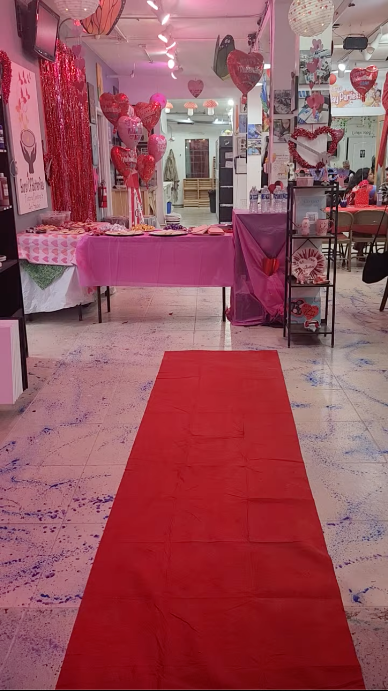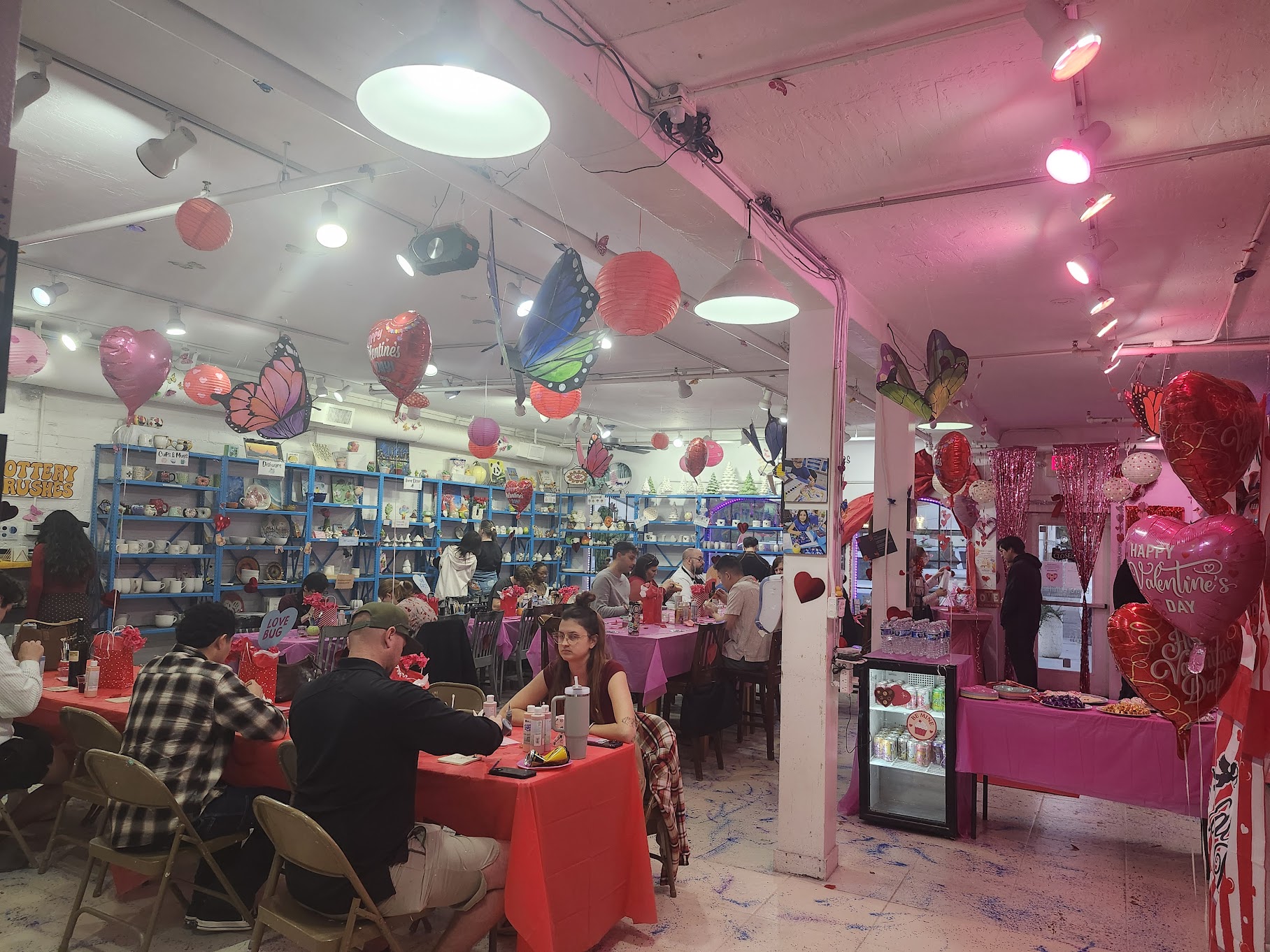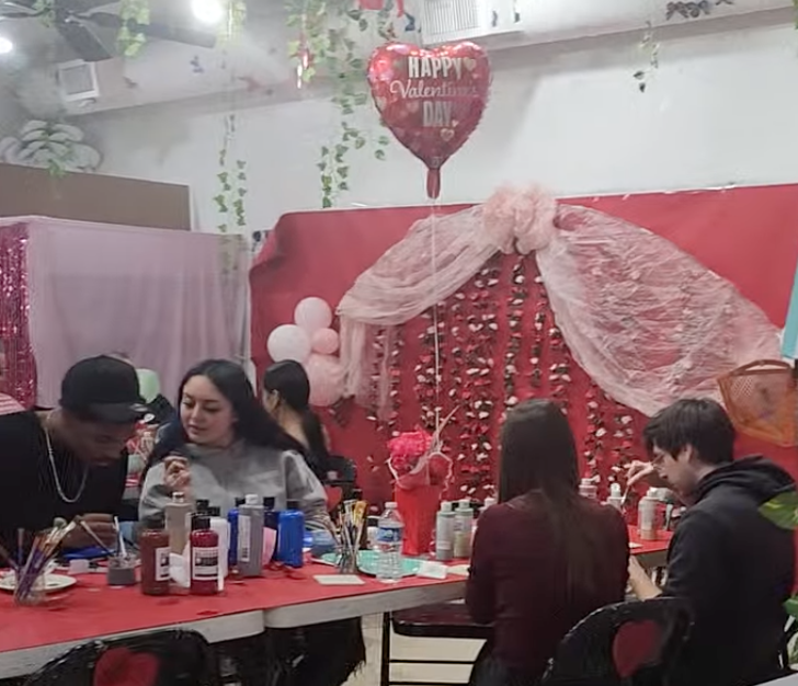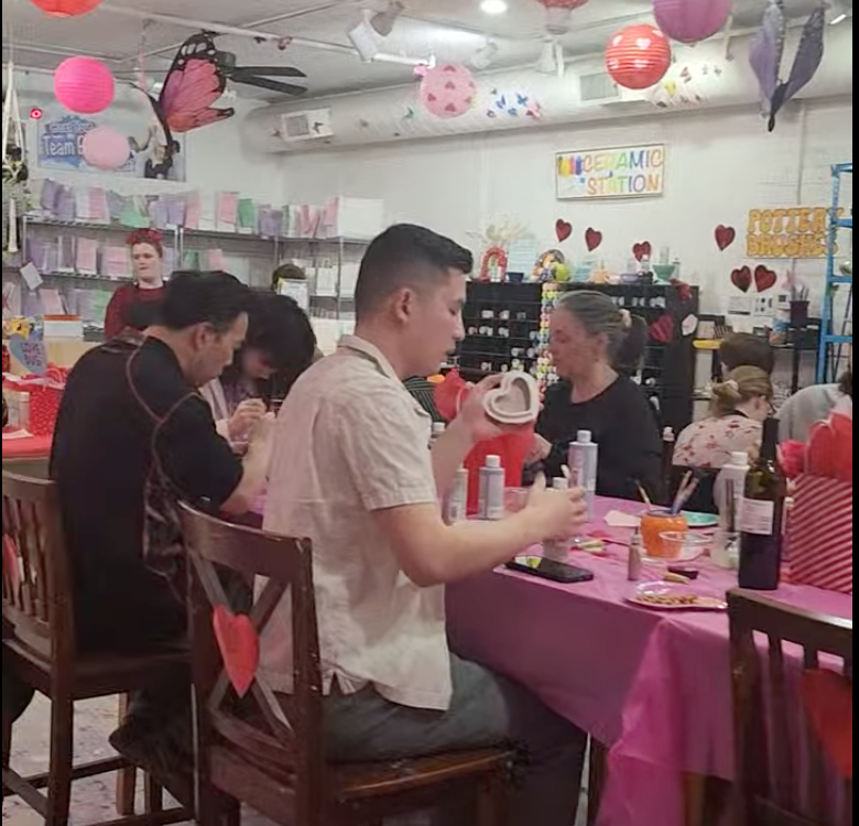 Music playing. Red décor glowing. Photo booth flashes going off. Friends, couples, and first-timers all gathered around tables, ready to create.